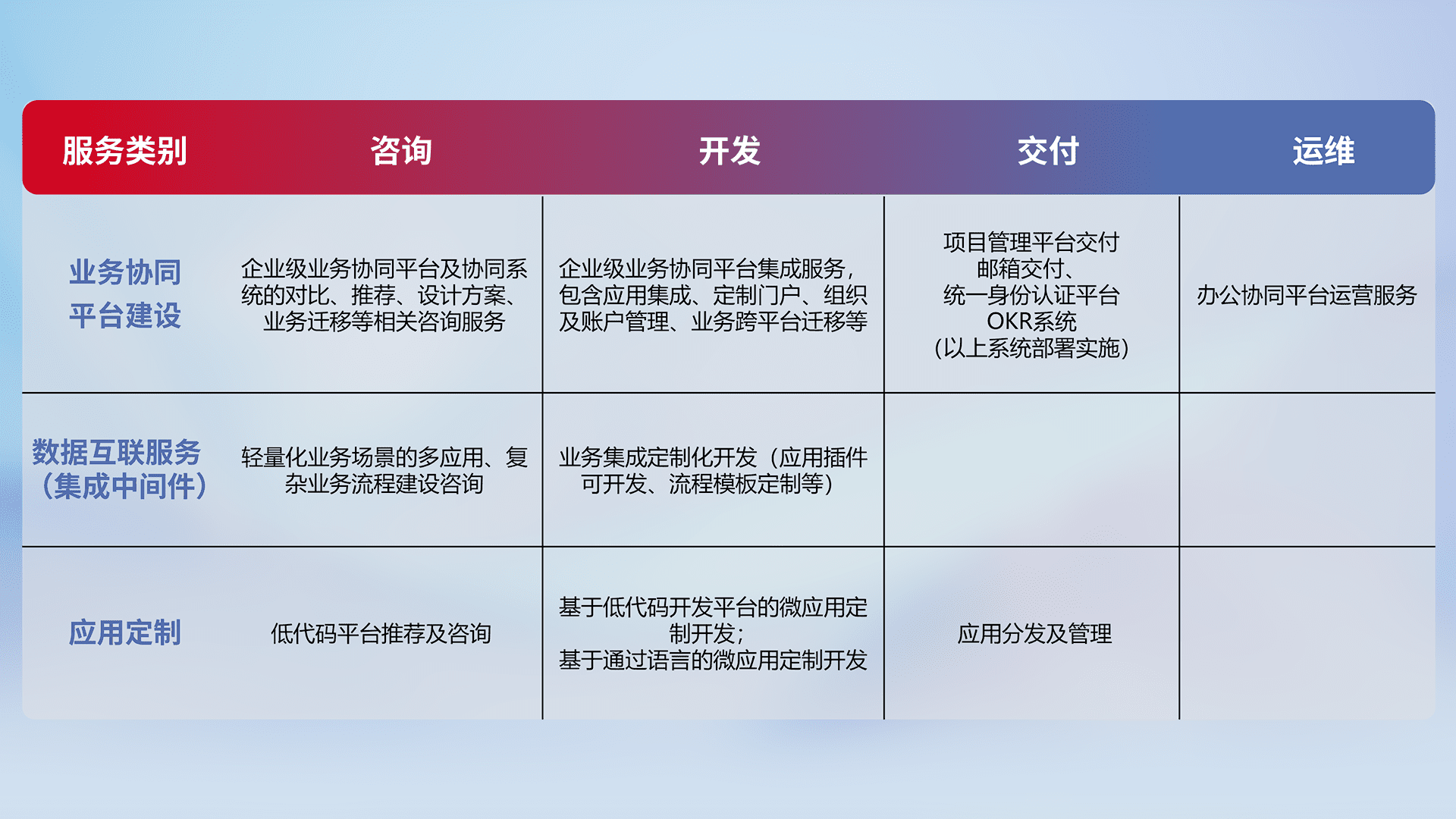 针对钉钉、、、企微、、IDaas等平台级产品提供产品的规划、、、方案、、交付、、定制化开发等服务,,实现如统一协同办公、、、、智能客户服务、、、混合会议管理、、、、智能数据查询、、、、等业务场景,,实现数字化转型。。。